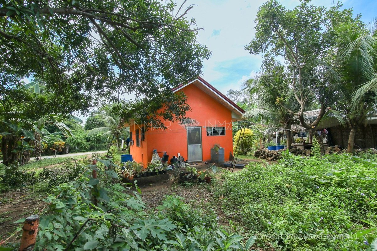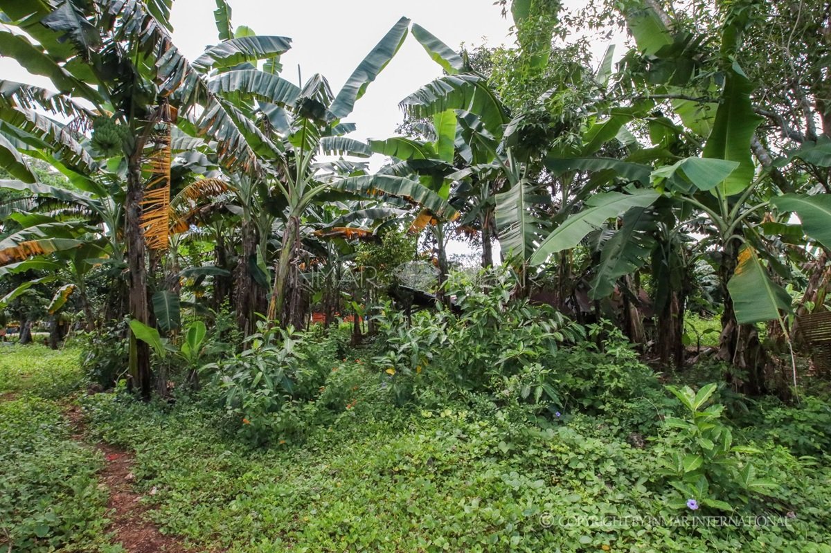 The house is fenced for added security and privacy. The lot is planted with banana and coconut trees, complemented by plants along the border, creating a well-maintained tropical setting.