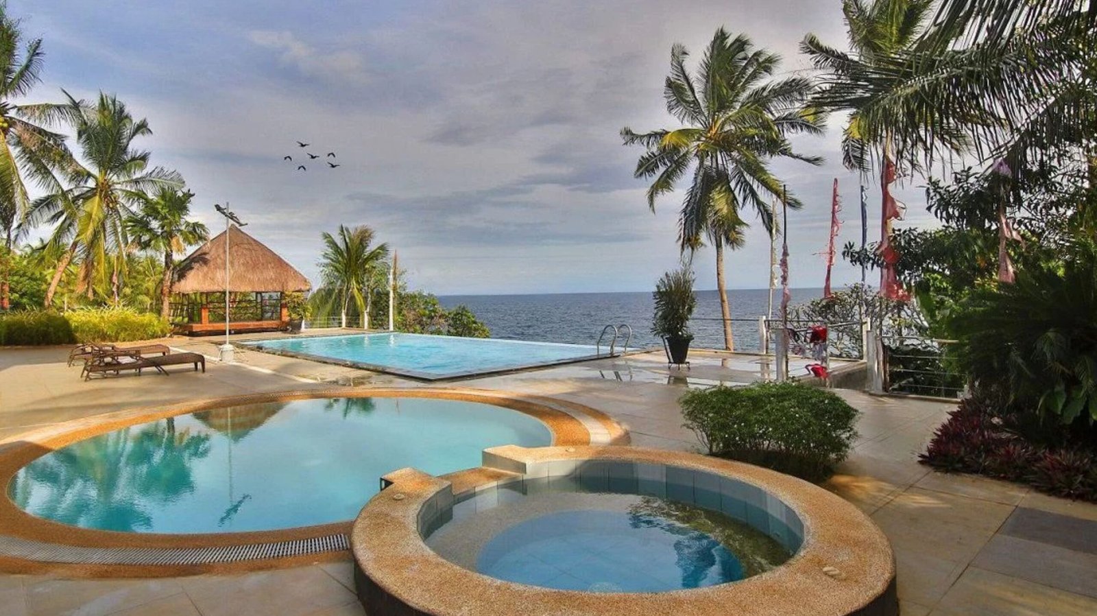 - Infinity Pool and Jacuzzi: The resort features an infinity pool that blends seamlessly with the ocean horizon, accompanied by a soothing jacuzzi—both set on a spacious deck surrounded by tropical greenery and ocean views.
