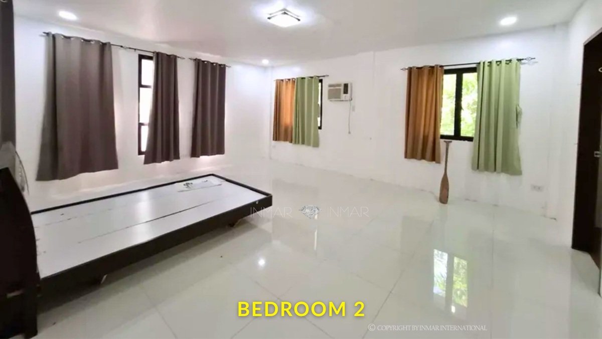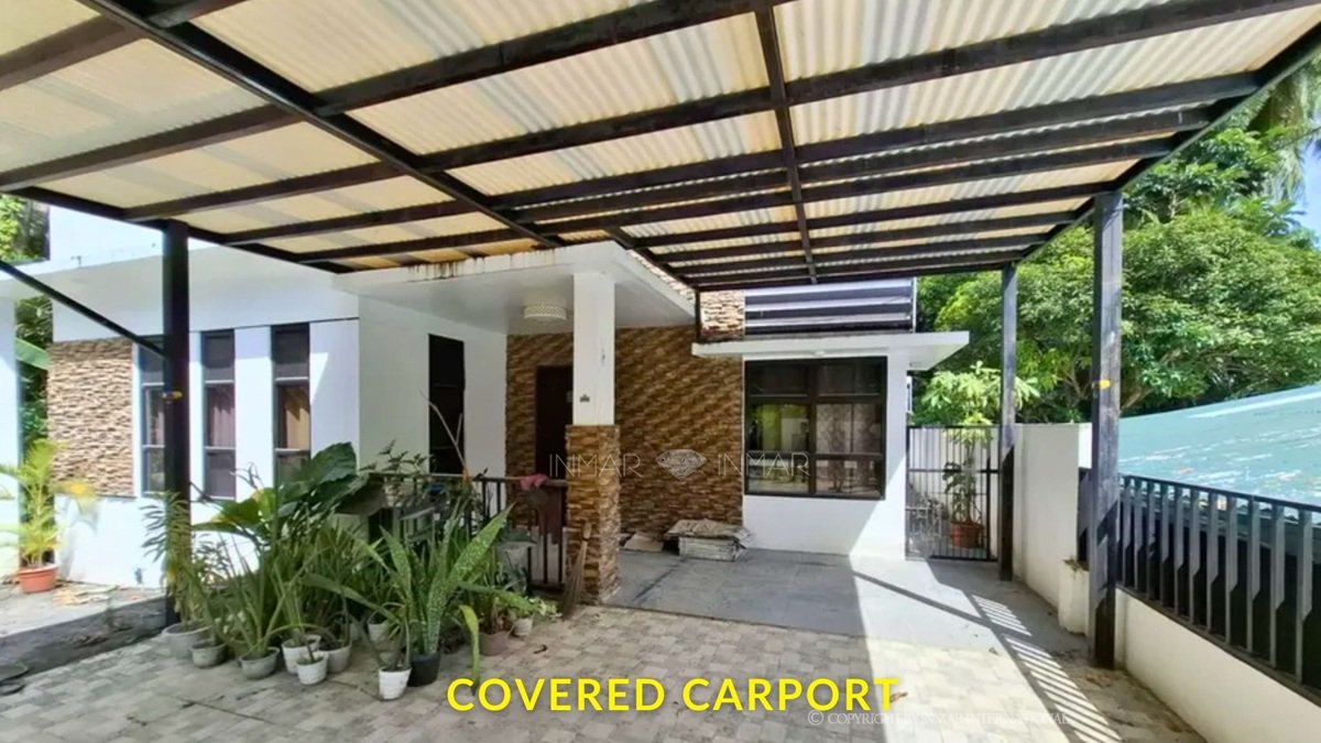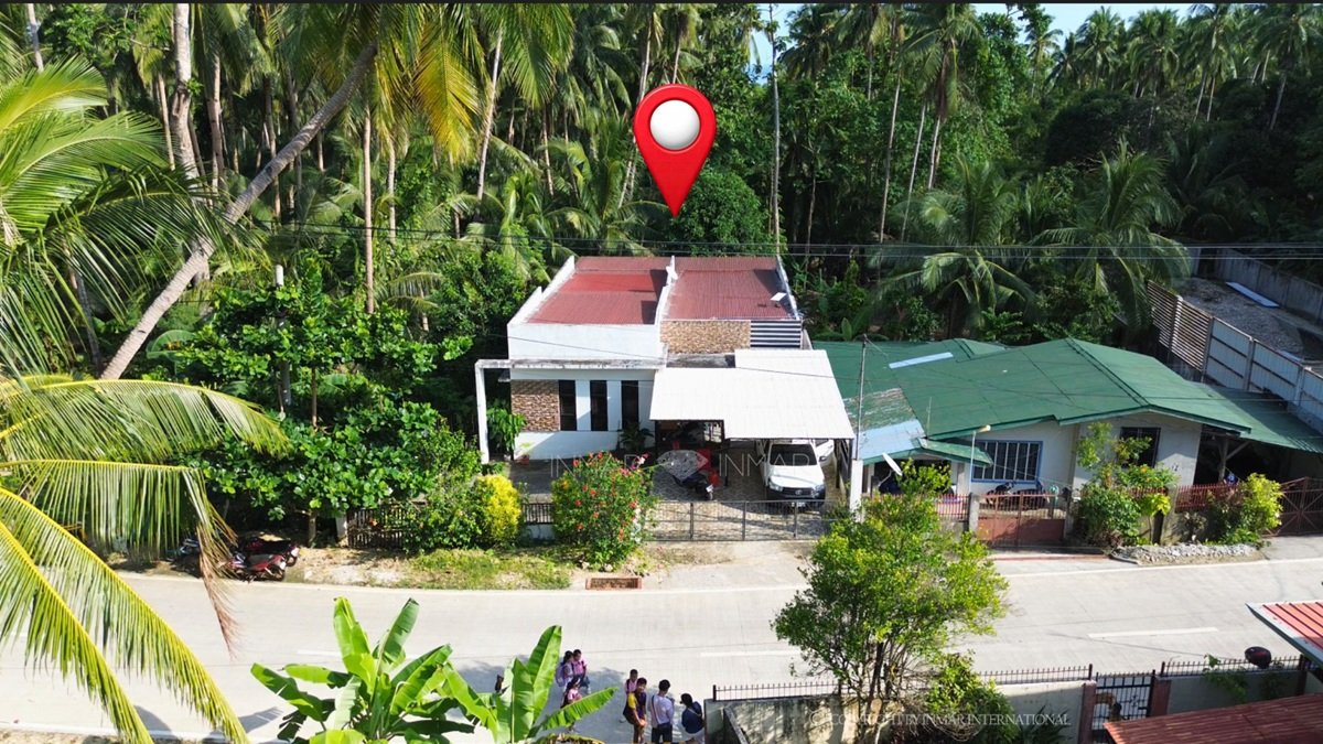 This 2-bedroom house is located on a 1,358-square-meter lot, along the road and near the beach, offering easy access while maintaining a quiet island atmosphere. The property is also close to nearby local shops, providing everyday convenience. The house is fenced for added security and privacy. The lot is planted with banana and coconut trees, complemented by plants along the border, creating a well-maintained tropical setting.