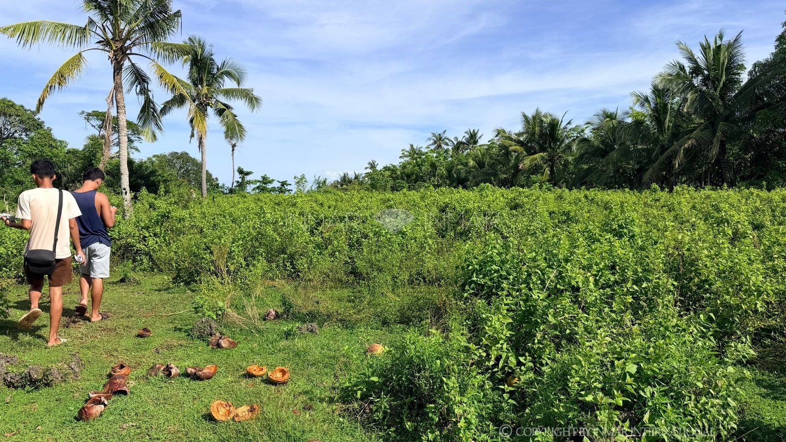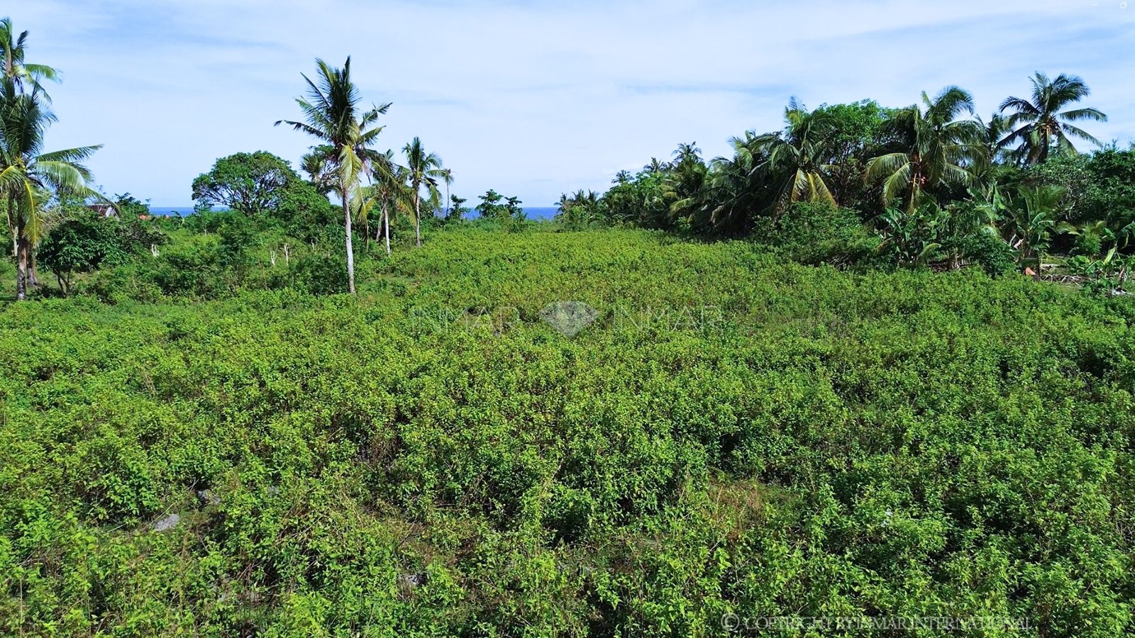 The land is mostly flat, making it practical for development, with a rocky section along the cliff edge that adds natural character and stability. The property is planted with coconut trees, providing a natural tropical setting.