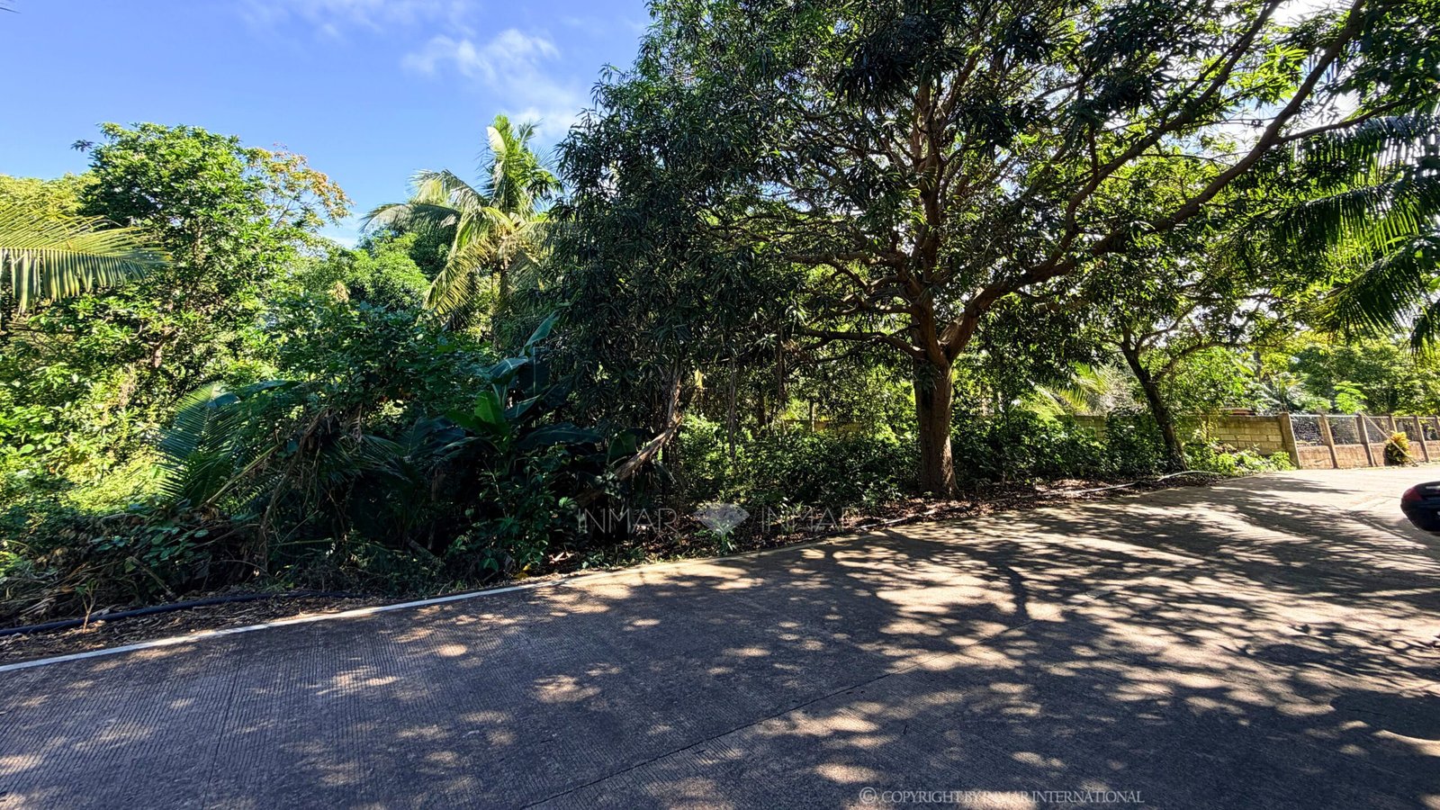 The property is generally flat and planted with coconut, mango, and other tropical trees, giving natural shade and greenery. The lot boundaries are clearly identifiable, and the road frontage makes it suitable for both private residential use or small rental development.