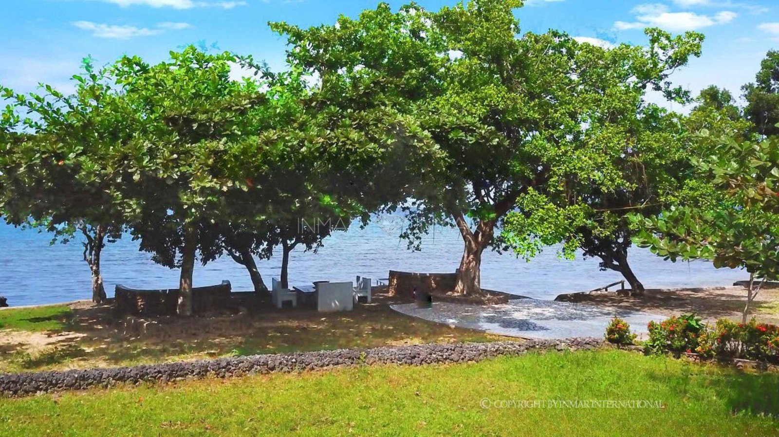 A seating area and concrete stairs leading down to the water are already in place, allowing direct access to the shoreline. The cliff height is manageable and suitable for future viewing decks or cliffside structures.